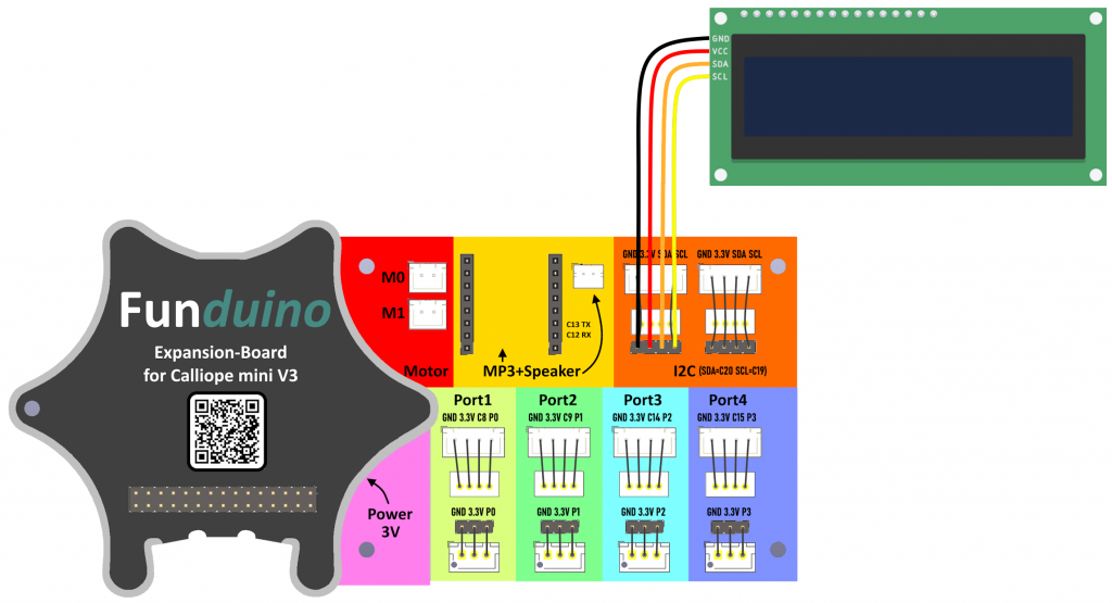 Das Display erhält seine Daten über die I2C Schnittstelle. Daher verbinden wir das Display mit den Kontakten im orangefarbenen I2C-Bereich des Expanders.