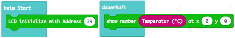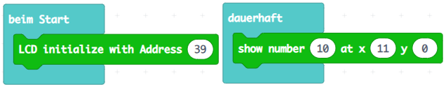 Das ist viel einfacher als du vielleicht denkst. Es gibt in der Programmrubrik „I2C_LCD1603“ einen Programmblock mit dem Namen „show number 10 at x0 y0“.