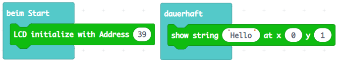 In dem Programmblock „beim Start“ fügen wir aus der Rubrik „I2C_LCD1602“ den Programmblock „LCD initialize with Address 39“ ein.