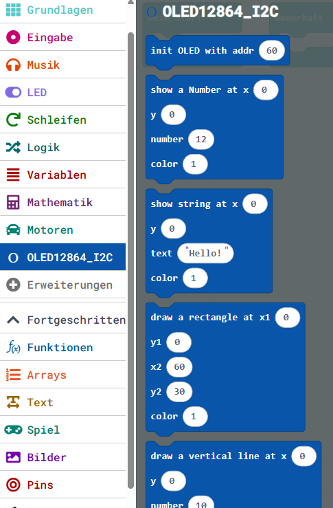 In den Programmblöcken erscheint eine neue Rubrik mit dem Namen „OLED12864_I2C“. Hier finden wir nun alle Funktionen rund um das Display.