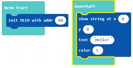 Dazu verwenden wir einen weiteren Block aus der Programmrubrik „OLED12864_I2C“. Der Block den wir nun verwenden heißt „show string“. Das vollständige Programm sieht jetzt folgendermaßen aus: