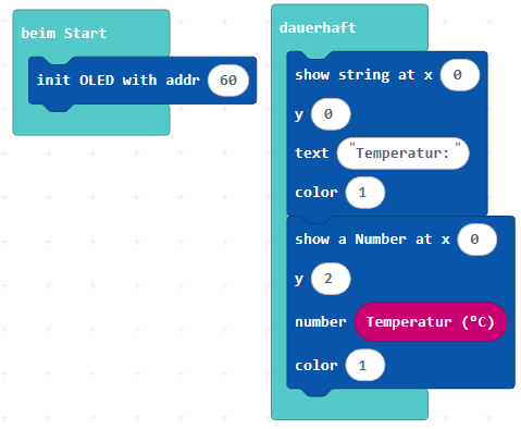 Jetzt würde im OLED die Zahl 12 erscheinen. Daher tauschen wir noch schnell die Zahl zehn gegen den Temperaturmesswert aus. Der Programmblock für die Temperatur befindet sich in der Rubrik „Eingabe“ und heißt „Temperatur (°C).