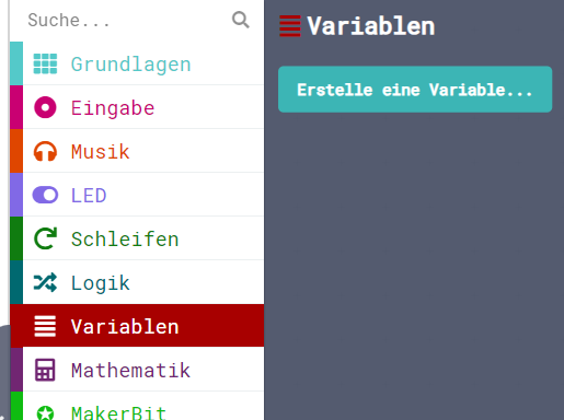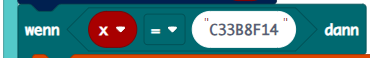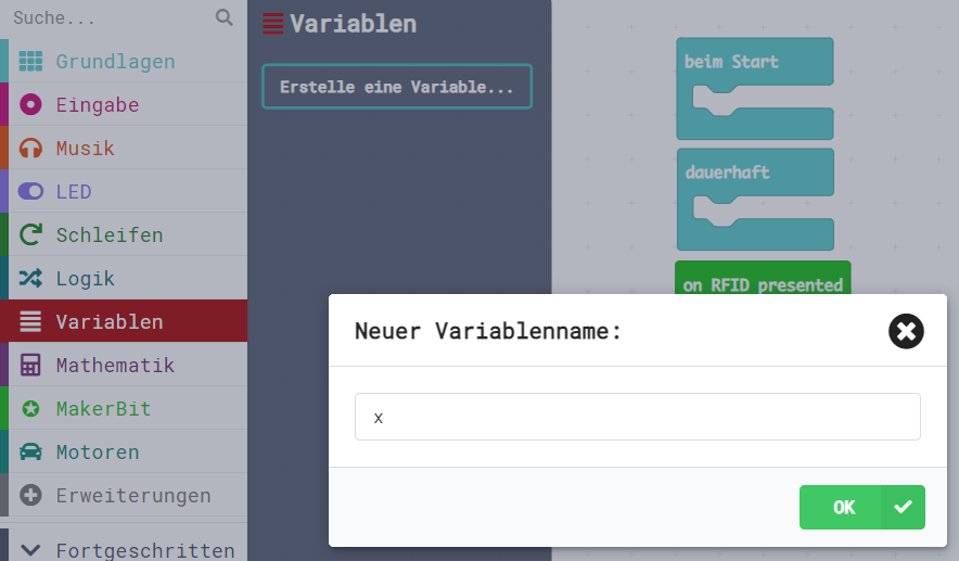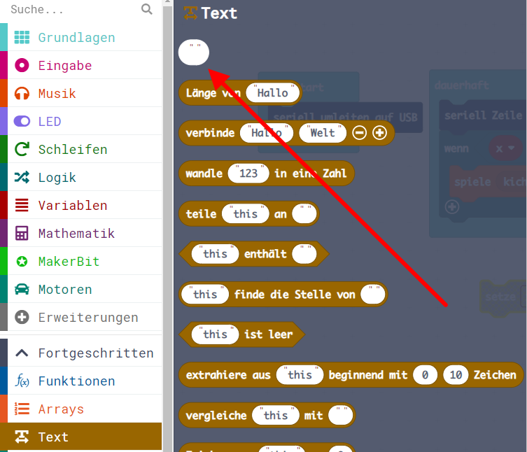 Daher muss man in dem Programmblock für die Variable manuell einen Textblock einfügen. Den Textblock finde ich in der Programmrubrik „Fortgeschritten“ → „Text“