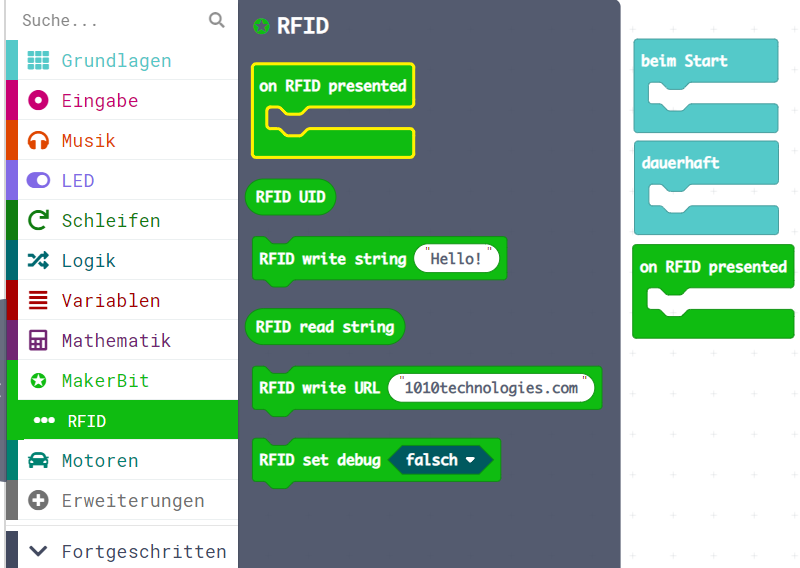 In der Mitte siehst du eine große weiße Fläche mit einem gelben Rahmen. Das ist dein Programmierbereich, wo du die Programmblöcke hinziehst. Wir starten mit dem Block „beim Start“ und dem Block „dauerhaft“. Für diejenigen, die mit der Arduino IDE gearbeitet haben, ist dies gleichzusetzen mit „setup“ und „loop“.